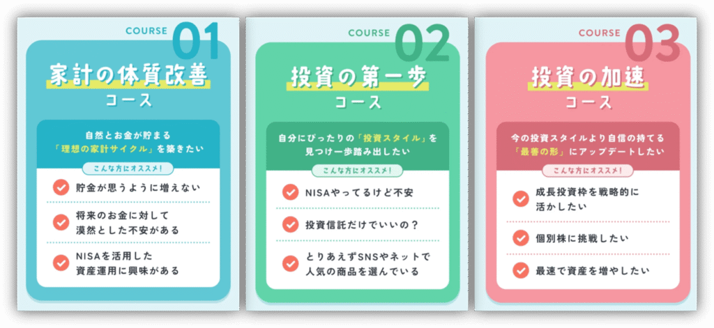 これからNISAを始める初心者さんから、投資で資産収入を増やしたい上級者まで、幅広いレベルの人が満足できる講座が用意されているよ!