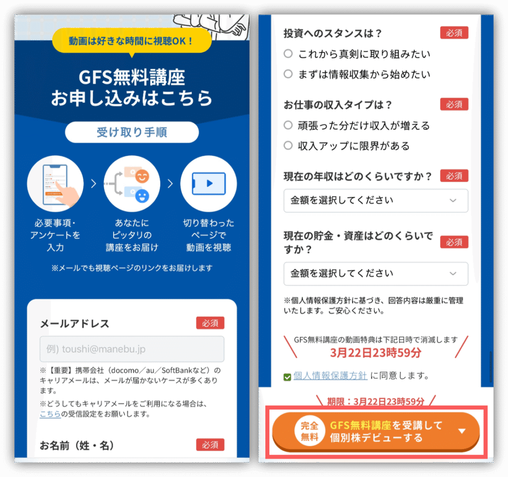 すべての入力が終わったら、もう一度「GFS無料講座を受講して個別株デビューする」をタップ☺️