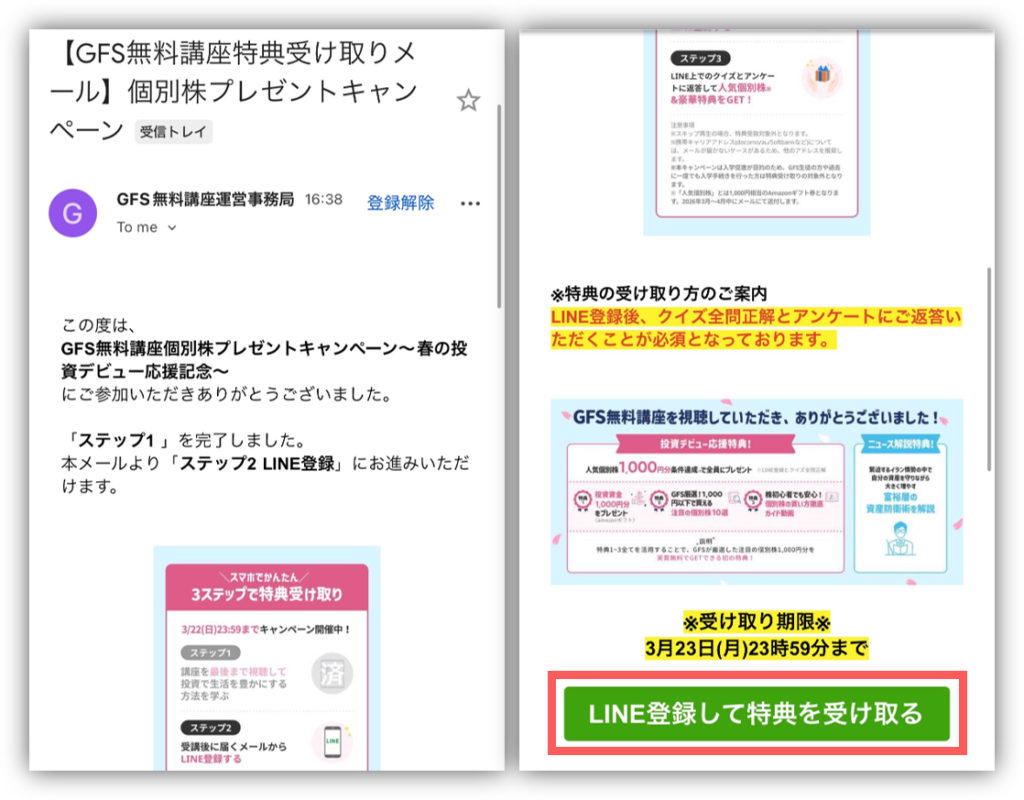 そのメールに記載されている「LINE登録して特典を受け取る」をタップ🙌