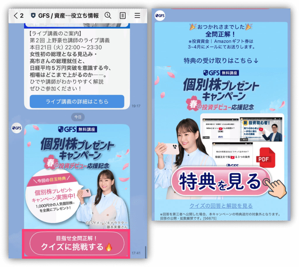 すべての回答が終わると、同じLINEに豪華特典が送られてくるよ🎁