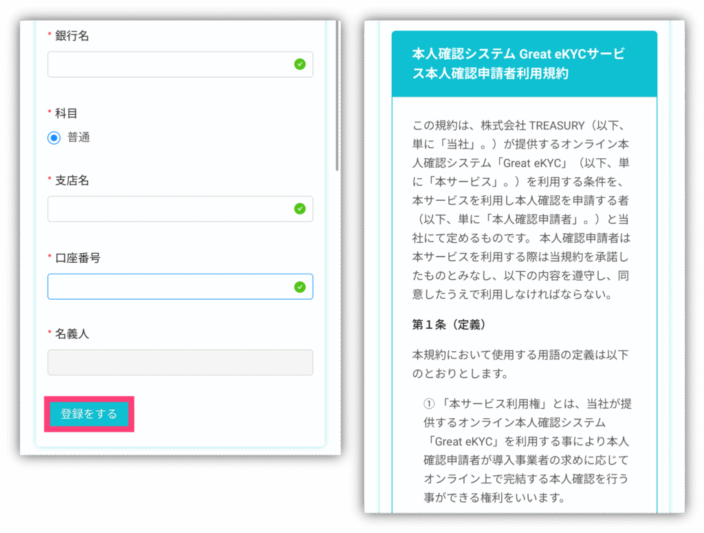 登録する銀行口座の情報を入力して「登録する」をタップ。
