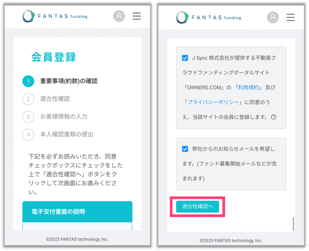 重要事項を確認し、ボックスにチェックを入れてから「適合性確認へ」をタップ。