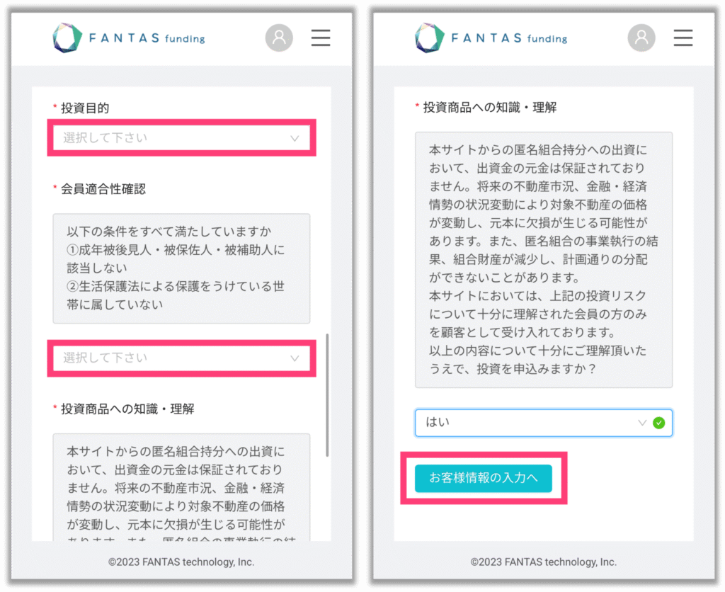 投資目的と会員に必要な条件を満たしているかを選択したら「お客様情報の入力へ」をタップ。