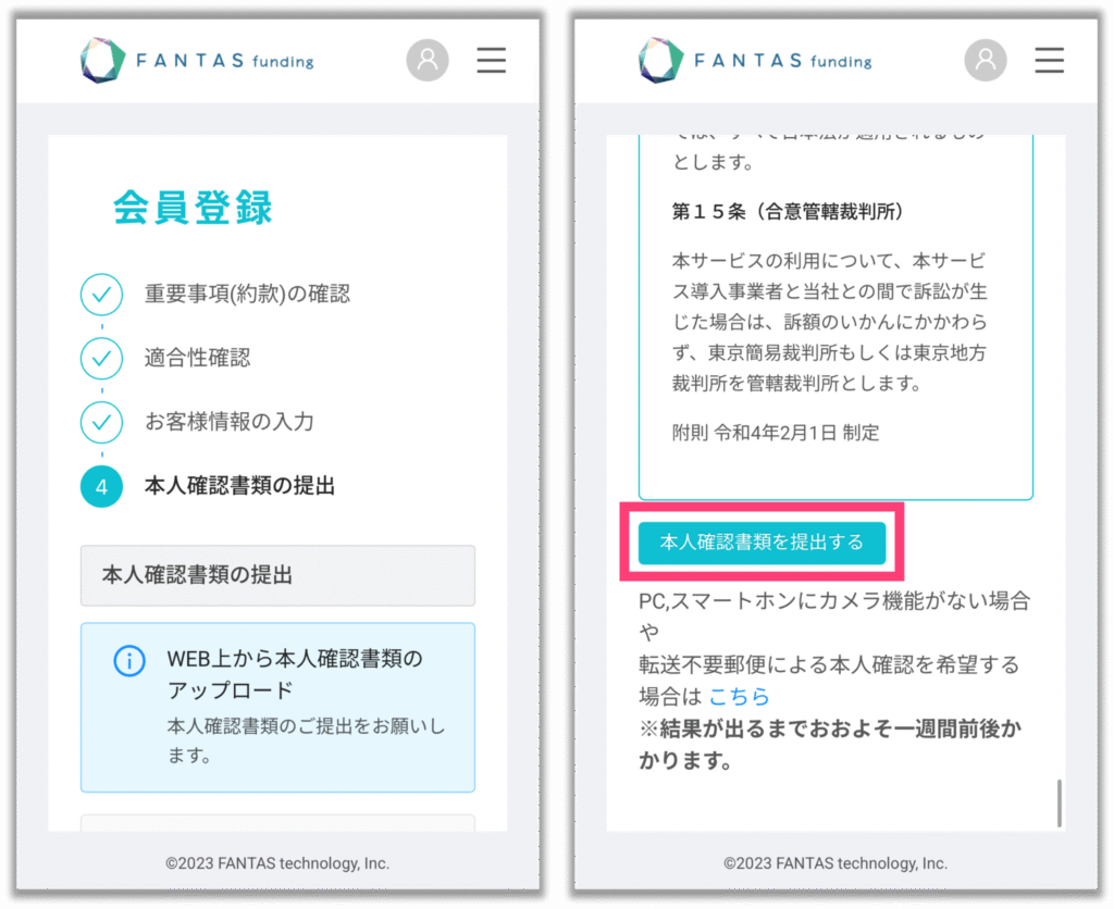規約を確認して「本人確認書類を提出する」をタップしてね。