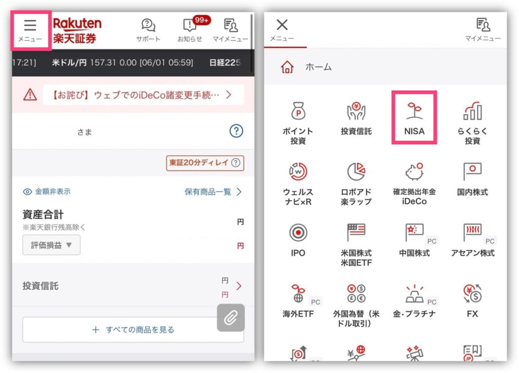 まずは、楽天証券にログインして「メニュー」→「NISA」の順にタップするよ。