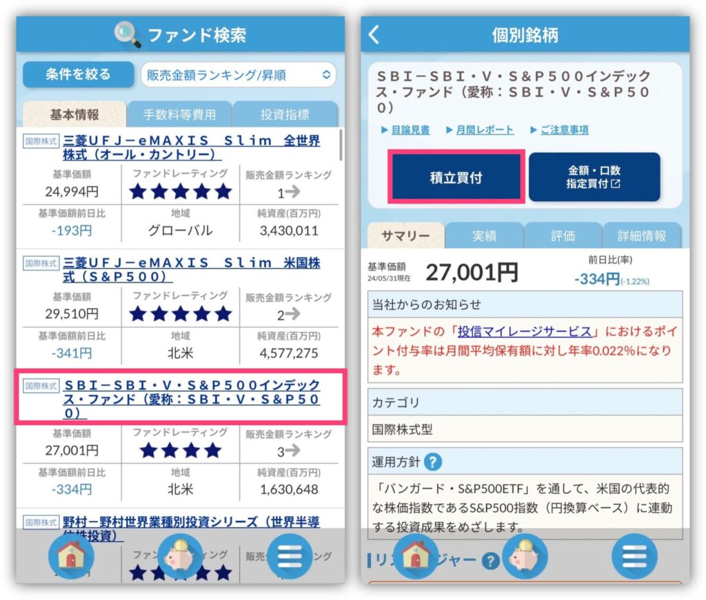 「購入する商品」を選んでタップし、「積立買付」をタップしてね!