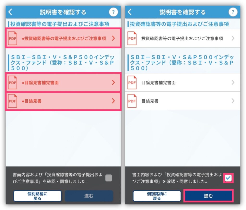 投資信託の補完説明書も確認し、問題がなければ「同意して次へ」をタップしよう。