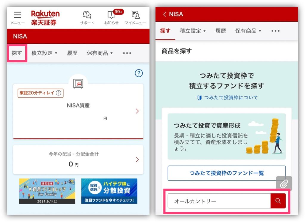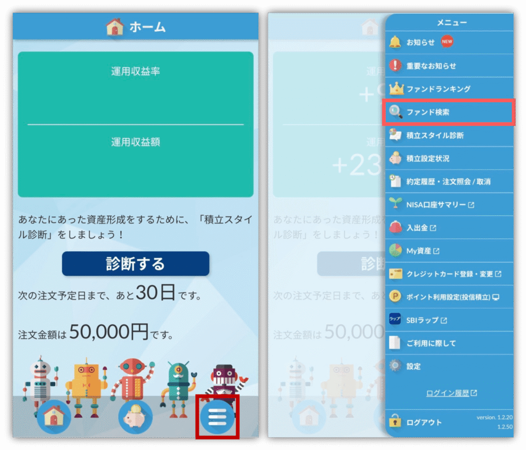 「右下のメニューボタン」→「ファンド検索」の順でタップ。