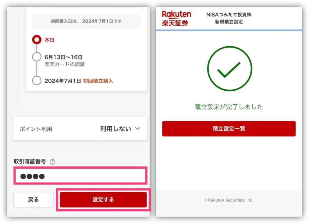 最後に「設定する」をタップすると積立設定が完了し、積立が開始されるよ☺️