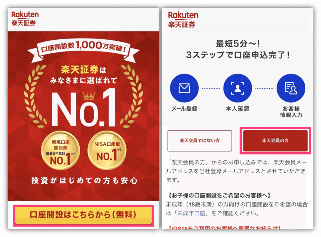 まずは、以下のボタンから楽天証券の口座開設サイトにアクセスしてね!