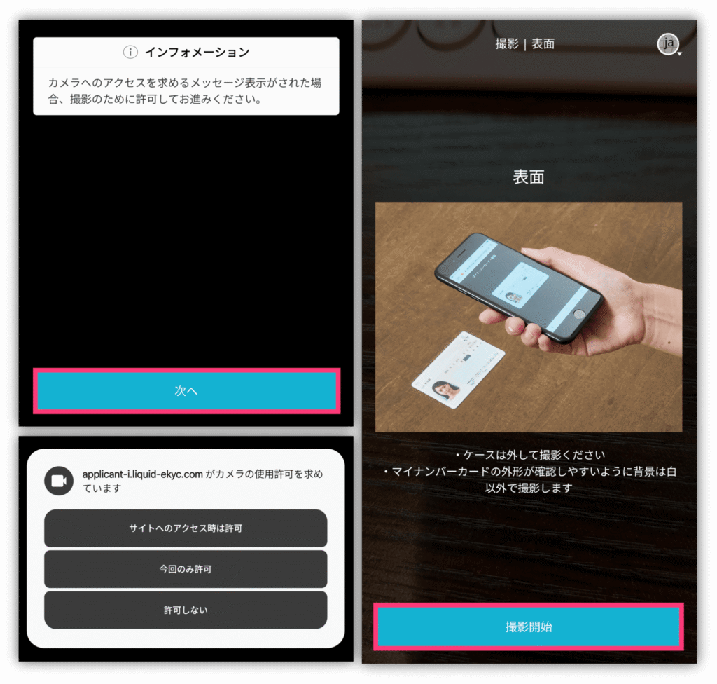 「撮影開始」をタップしたら、画面の指示に従って「表面」「厚み」「裏面」の3パターンでマイナンバーカードを撮影するよ☺️