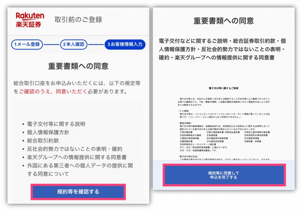 最後に「規約等を確認する」をタップし、重要書類が表示されたら「規約等に同意して申込を完了する」を選択して申込完了❣️