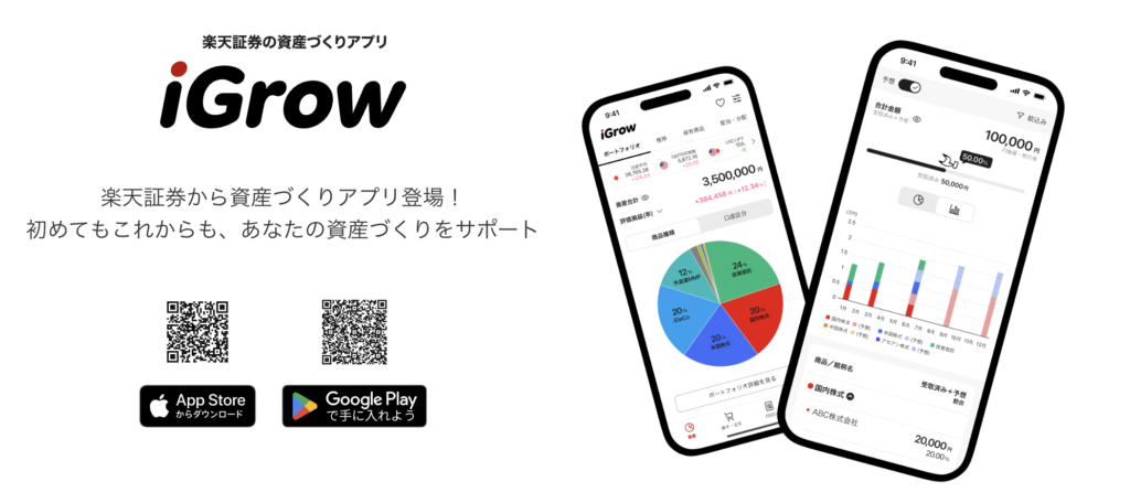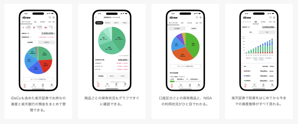 「iGrow」は楽天証券のメインアプリで、楽天証券の資産と楽天銀行の預金をまとめて管理できる!
