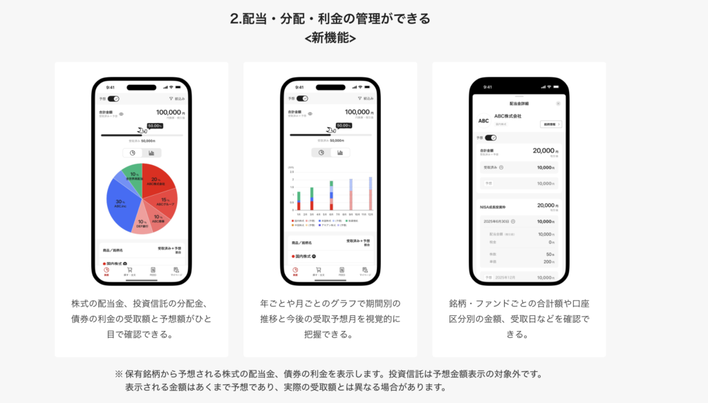 資産が増えていく様子がグラフで簡単にチェックだけでなく、株の配当金の予想額も教えてくれるよ✨